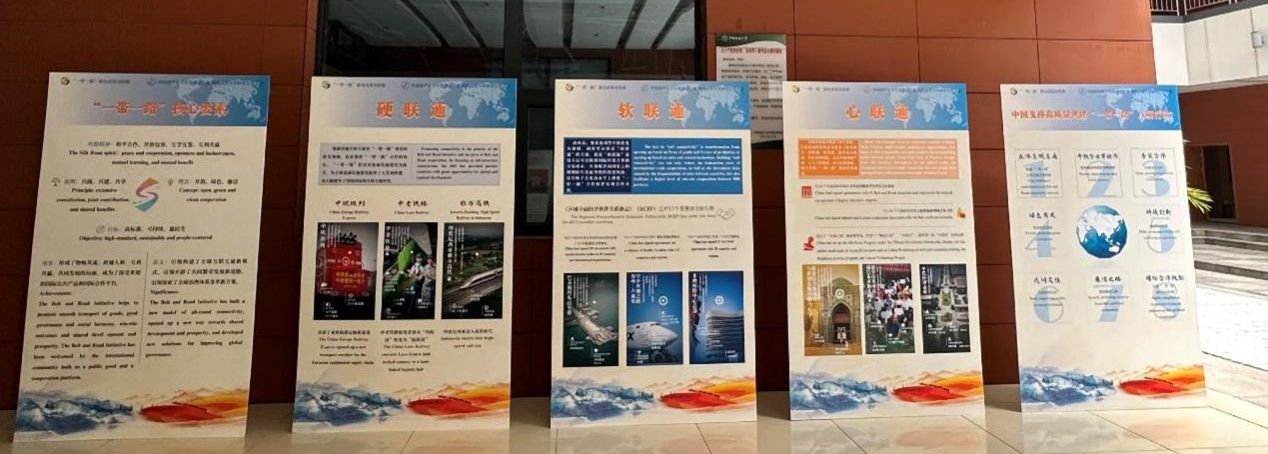 此次活动展板内容丰富,包含“一带一路”倡议简介、习近平总书记关于“一带一路”的重要讲话节选、共建“一带一路”在硬联通、软联通、心联通方面的成果等内容,以权威的表述、生动的展示、详实的数据多方面展现了“一带一路”十年来的伟大成果。双语展览也延续了学院以专业素养服务红色文化国际传播的优良传统,通过查证、翻译、审校英译文本,各位学生党员通过专业训练既加深了对习近平外交思想的理解、提升政治素养,也激发了学以致用、专业报国的使命感。