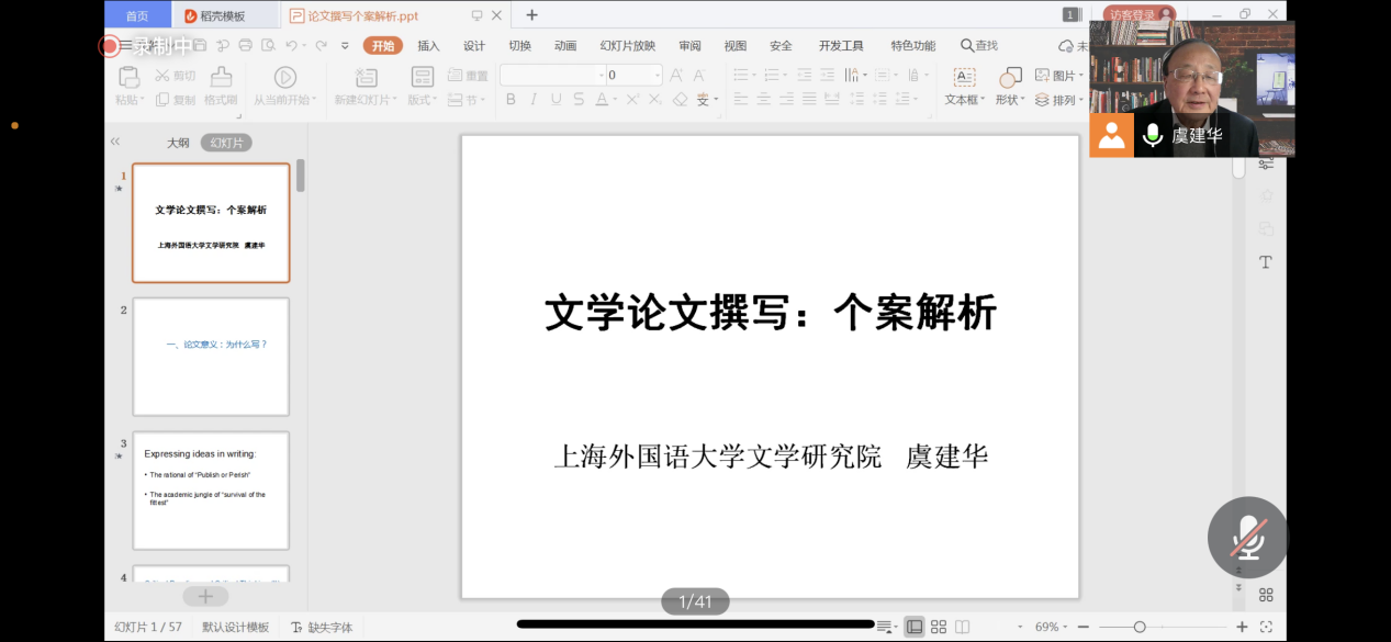 (通讯员:黄皓亮 金梓轩)2021年11月25日下午14:00,中国地质大学(武汉)欧美人体视频一区二区三区“南望今声”外语论坛系列讲座如期召开。上海外国语大学文学研究院的虞建华教授应邀为我院师生做题为“文学论文撰写:个案解析”的讲座。本次讲座采取了线上腾讯会议直播的形式,我院共140余名师生参与学习交流。