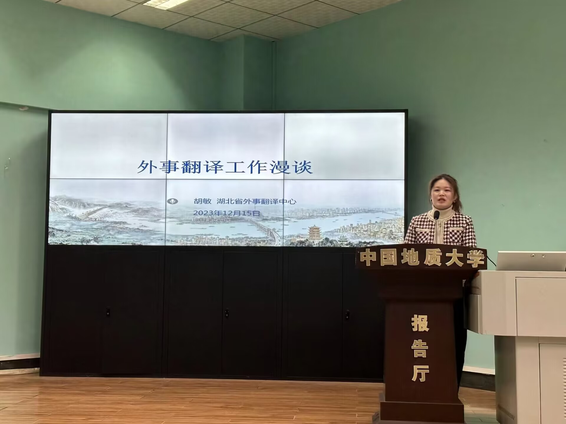 2023年12月15日上午9时00分,中国地质大学(武汉)欧美人体视频一区二区三区“南望今声”外语论坛系列讲座第60期在北一楼120学术报告厅举行。主讲人湖北省外事翻译中心英语翻译胡敏女士,应邀开展了主题为“外事翻译工作漫谈”的精彩讲座。此次讲座由欧美人体视频一区二区三区杨红燕副教授主持,八十余名师生参会。