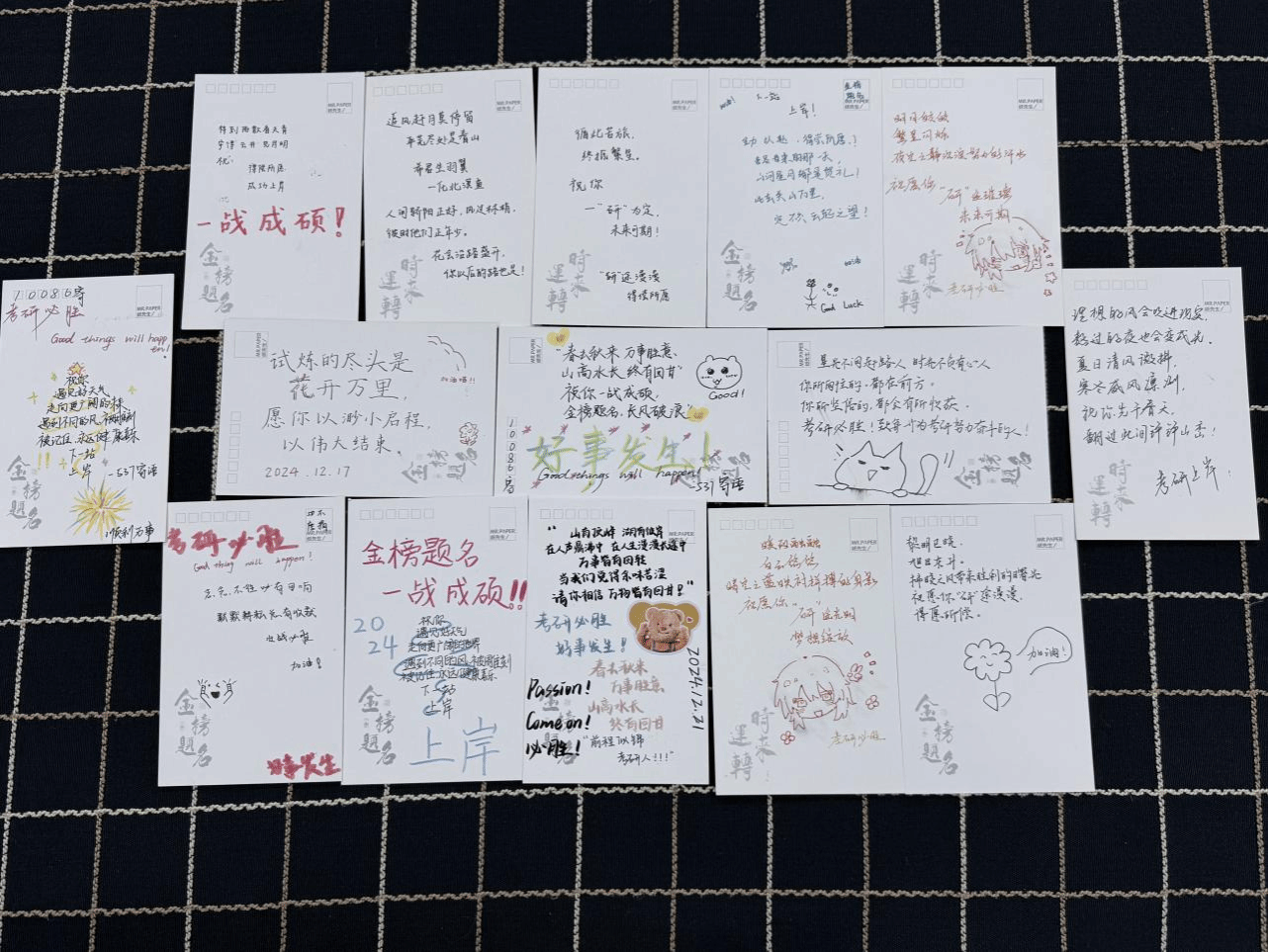 考研之路,如寒冬般孤寂,可温暖的春日就在眼前。希望考研学子们能够“暖宝”贴身寒意消,天天学习天天“棒”,“趣多”趣乐志高昂,考试如“德芙”般纵享丝滑,结果必定可喜“可乐”!此外,各位学弟学妹也精心书写祝福贺卡,他们诚挚的祝福文字将会陪伴每一个考研外国鱼!——此行必将蟾宫折桂,不负众望!