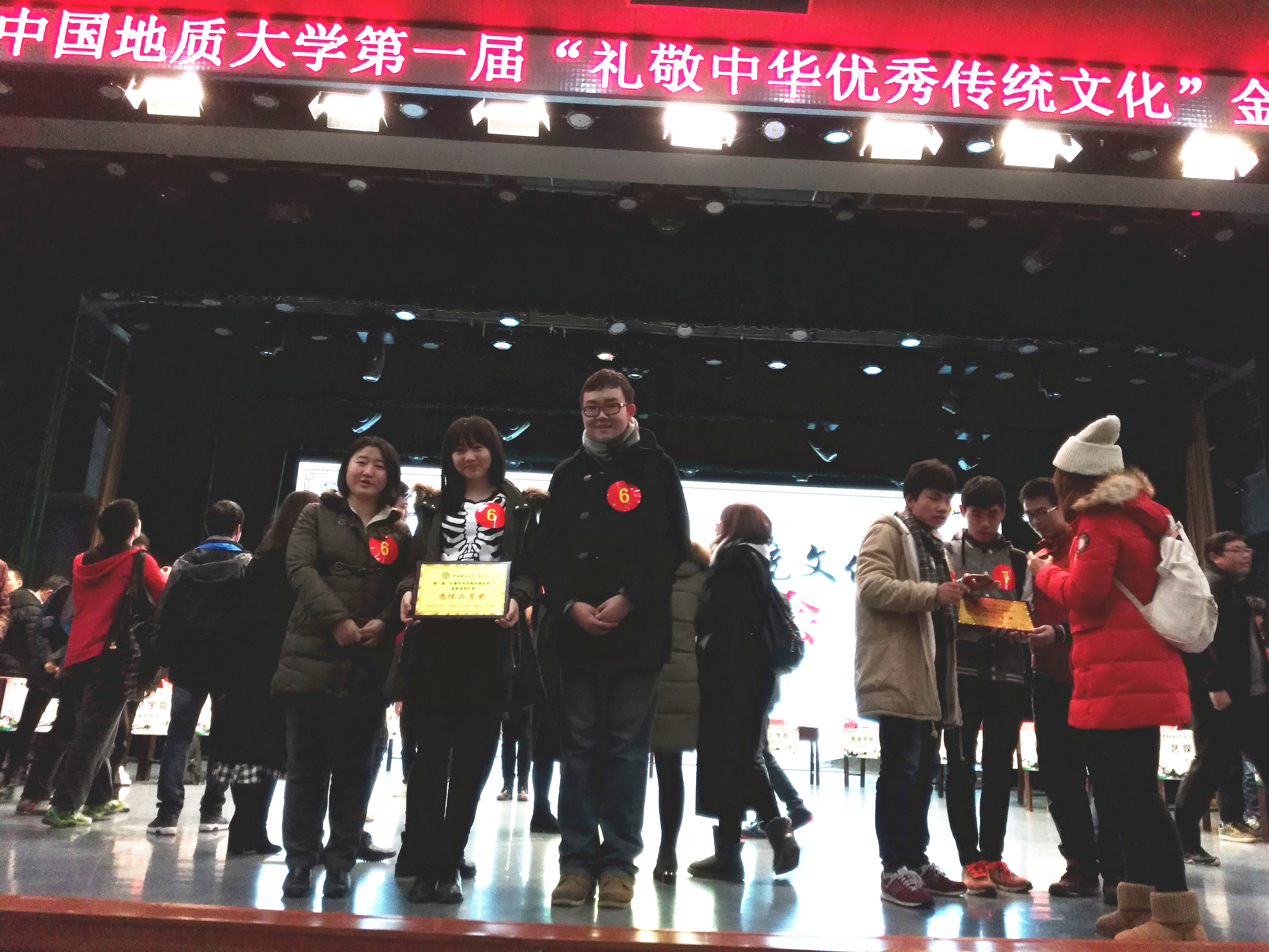 (通讯员 宁蒙)在11月25日,中国地质大学(武汉)第一届“礼敬中华优秀传统文化”金秋诗词大会在弘毅堂举行,我院研究生16级学硕班殷曼姝、本科生091134班何福麟、091142班胡金佩组成“江城子”队,代表学院参加了本次比赛,并获得团体二等奖的优异成绩。