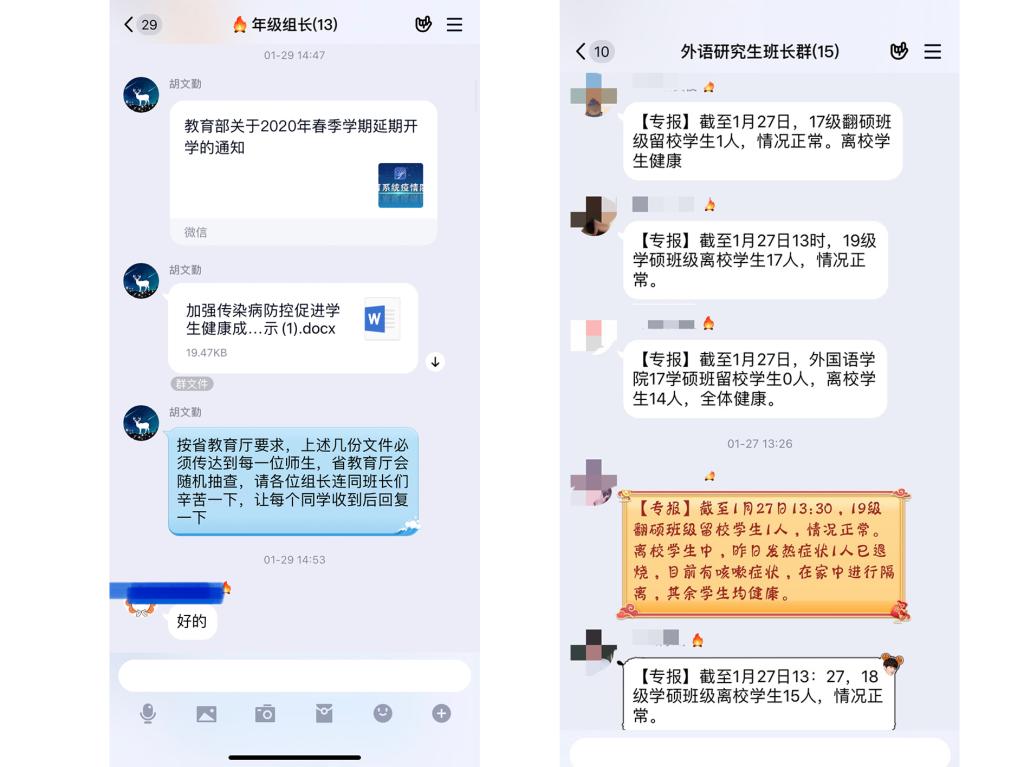 1.落实平安日报制度。1月24日,从一声声“新春快乐,平平安安”开始,欧美人体视频一区二区三区开始了同学们每天的平安报告,坚持“零报告”制度,做到本研学生100%全覆盖。与此同时,学院辅导员通过年级群、班长群、学务指导和班主任群、学生党员群、家长群等做好疫情防控的引导宣传工作,时时转发科学防疫注意事项以及相关工作通知。