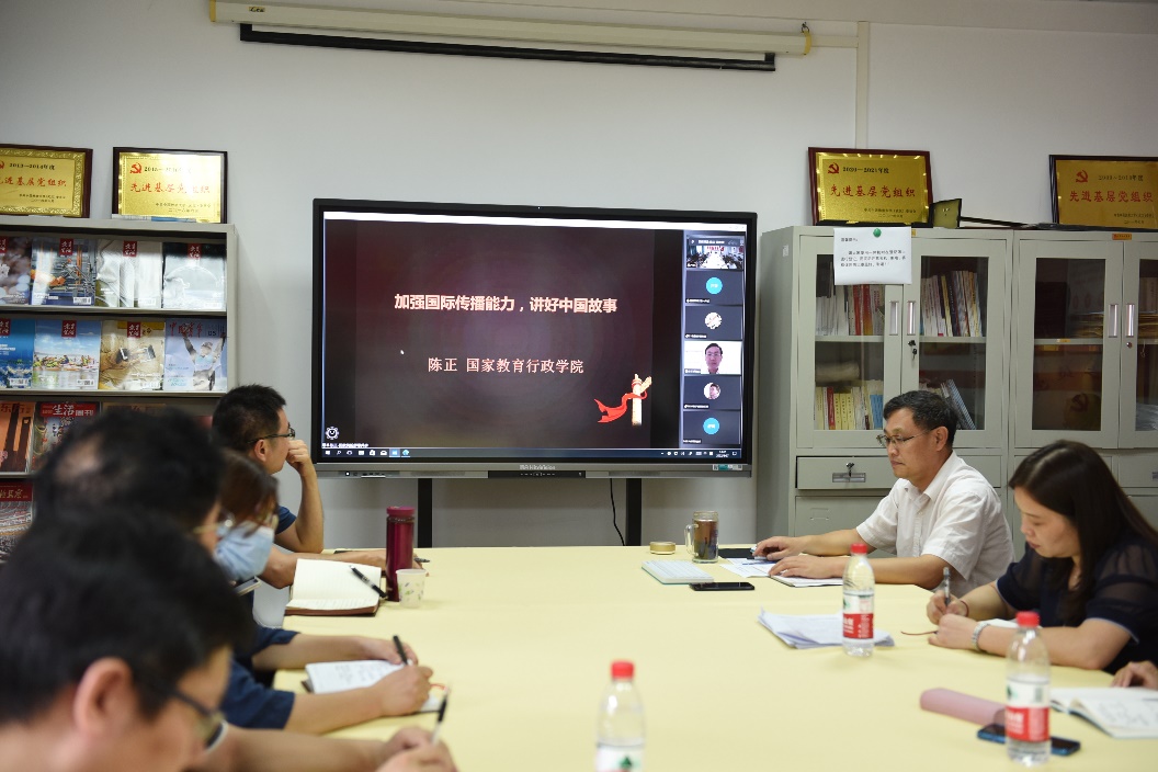 (通讯员杜冬琴、邓维 摄影 戴薇)2022年8月27日下午,作为学院新学期工作研讨会活动之一的 “南望今声”外语论坛第35期在欧美人体视频一区二区三区北一楼102会议室举行。应学院党委书记刘世勇邀请,国家教育行政学院教育领导与管理国际比较研究中心主任陈正副教授在线上为我院师生做题为“加强国际传播能力,讲好中国故事”的报告,报告由刘世勇主持,学院师生线上线下近200人参与学习交流。