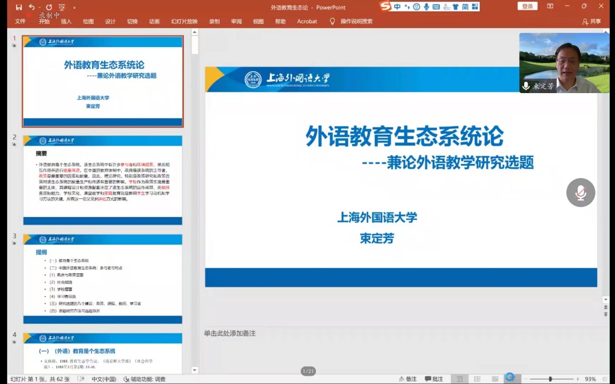 (通讯员 金梓轩 杨红燕)2022年9月22日上午9:30,中国地质大学(武汉)欧美人体视频一区二区三区“南望今声”系列讲座如期举行。上海外国语大学大学博士生导师束定芳教授应邀在线上为我院师生做了题为“外语教育生态系统论——兼谈外语教育研究课题”的讲座。讲座由欧美人体视频一区二区三区副院长张伶俐教授主持,我院师生共140余人参与了学习交流。