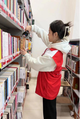 在本次活动中,志愿者们跟随着工作人员的脚步,分为2组进行工作:第一组的志愿者负责上架书籍的工作,主要工作安排是用机器扫描上架图书,并按图书类型分类上架。志愿者们徜徉在书籍的海洋里,感受着知识的波澜。轻取轻放,是对工作的负责,是对图书的爱护,亦是对知识的尊重。一本本图书经过志愿者的手中,回归书架,红白志愿服与古色古香的图书馆交相辉映,更添一分活力。志愿者们尽职尽责,乐此不疲,为图书馆的工作人员减轻了图书规整的工作负担,用热情、笑容和汗水传递着。