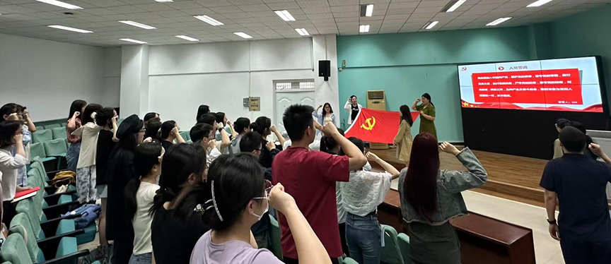 全体学生党员和出席嘉宾起立,高举右拳,面向党旗,重温入党誓词。全体党员宣读誓词,声音洪亮,重温了对党忠诚、积极工作的庄严承诺,进一步增强党员的责任感和使命感。